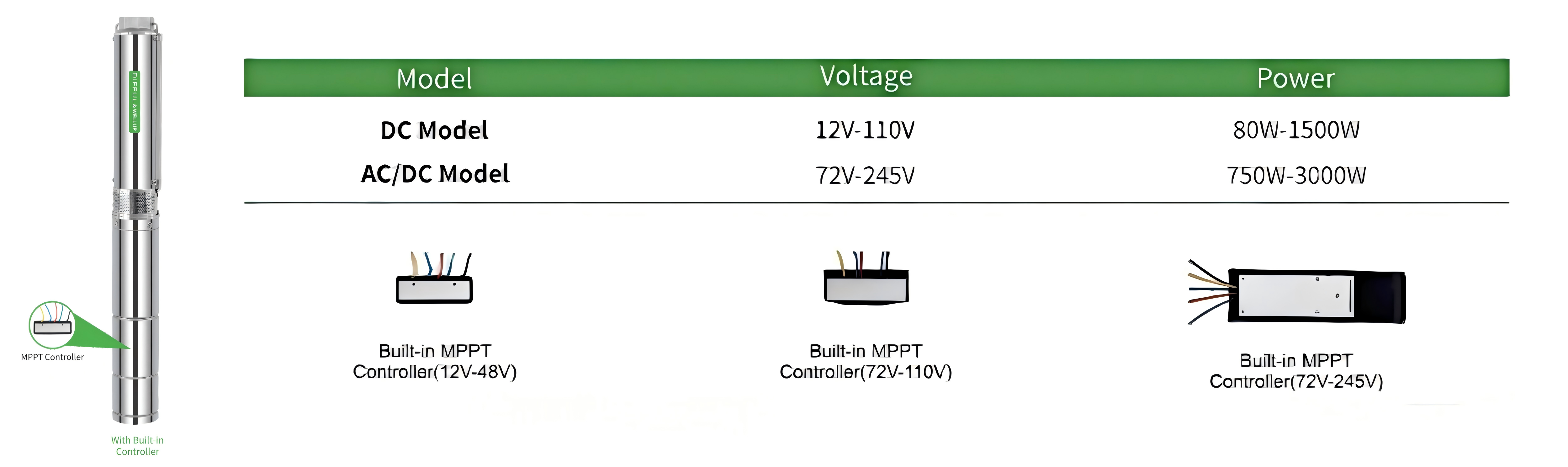 ITEM | Built-in Controller Model | Voltage | Optimum input voltage(DC) | Power | Max.Flow | Max Head | Outlet | Cable | Open circuit voltage (VOC) | VOC(-IN Model) |