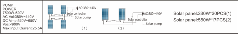 6HJPC68-85-380/520-7500-A/D | AC380/DC520V | 520V-650V | 7500W | 68m³/h | 85m | 3" | 2m | <900V | ≥1.3*PUMP POWER |