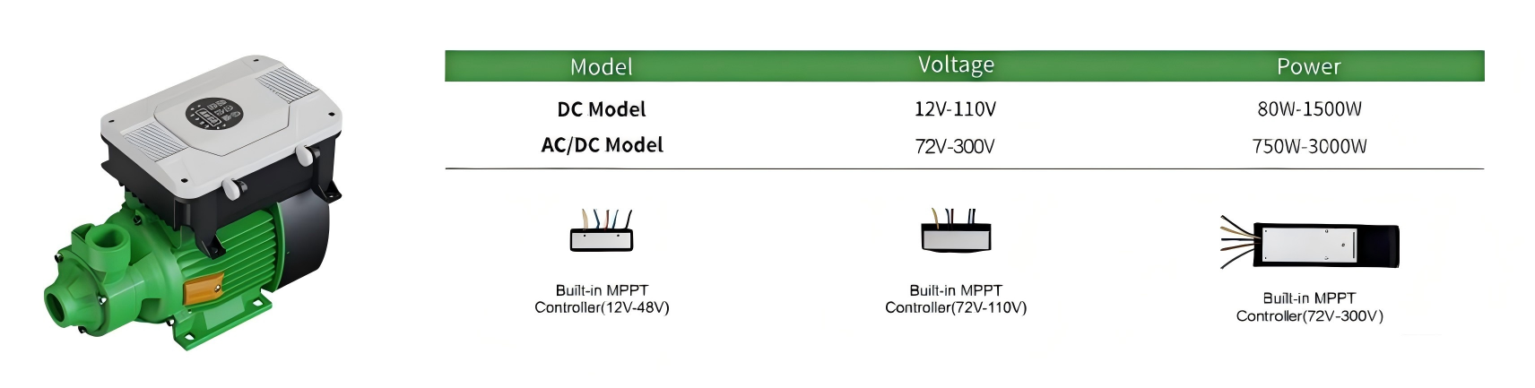 ITEM | BUILT-IN CONTROLLER MODEL | VOLTAGE | OPTIMUM INPUT VOLTAGE(DC) | POWER | MAX.FLOW | MAX.HEAD | OUTLET | CABLE | OPEN CIRCUIT VOLTAGE(VOC) | VOC(-IN MODED) |